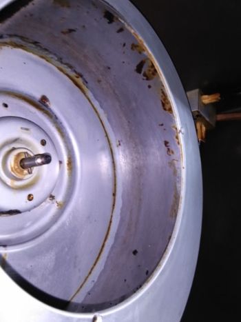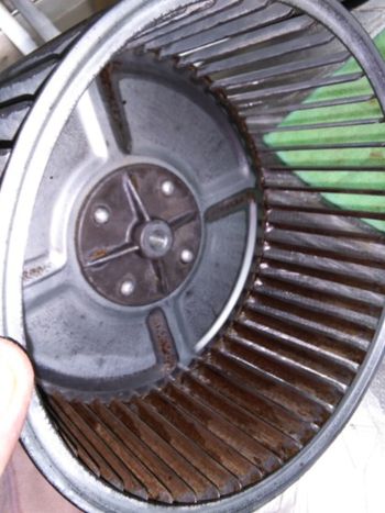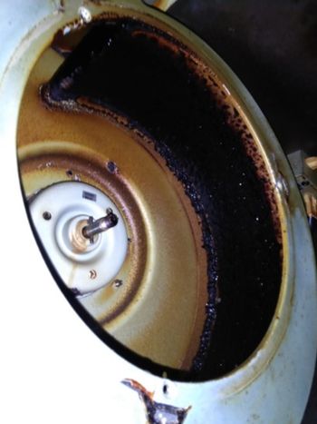 ファンがついていたドラムの中です。ここも油が付着しやすいのでかなり汚れます。黒い部分はファン同様固まった油です。ここまで硬くなって厚みを増した油ですと、市販のキッチン洗剤をつけても油が解けずなかなか落とすことができません。