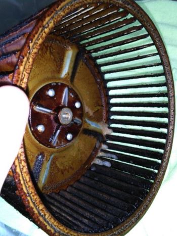 専用の洗剤でしっかり固まった油を除去したファンです。茶色いのは錆や変色です。油が長年付着すると金属を腐食しやすくなります。半年に1回、1年に1回など定期的にキレイにすることをお勧めします。