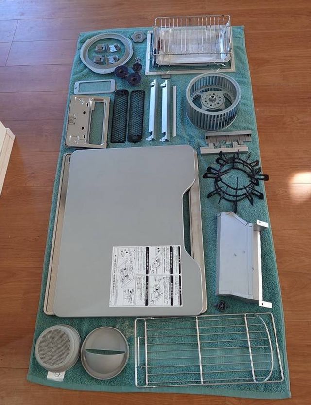 アルカリ洗剤で、堆積汚れ、油汚れを除去するのですが、色落ちしやすい部位、薬剤の跡が付きやすい素材の所は、適宜時間と内容を微調整してクリーニング実施しています。シロッコファンは熱湯で漬け置き洗いをします。