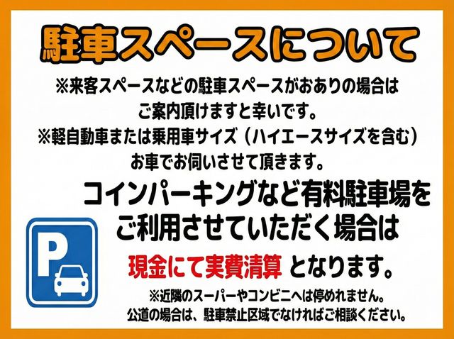 ・駐車場代金はお客さまにて当日現金にて作業費用とは別途ご負担いただいております。