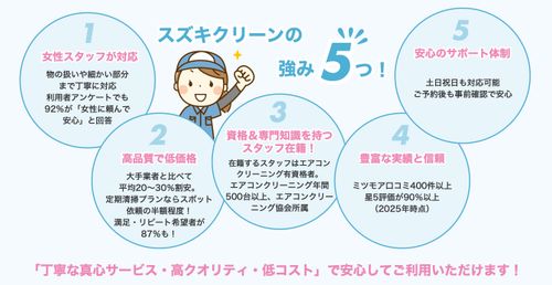 スタッフ全員が非喫煙者で、清潔な身なりと丁寧な接客を徹底。エアコンクリーニング士資格を持つスタッフが在籍しており、専門的な分解洗浄まで対応しています。