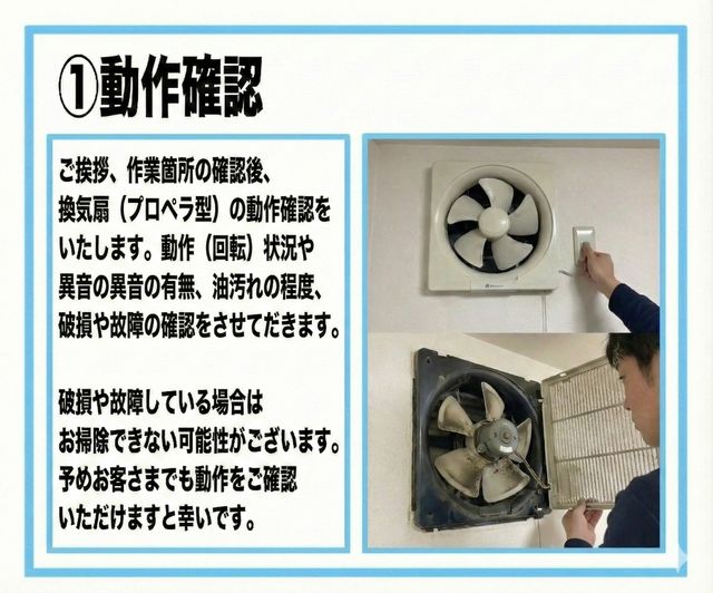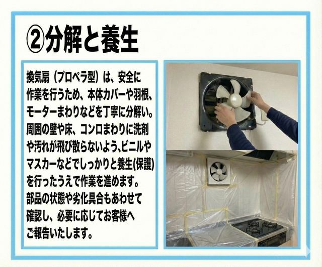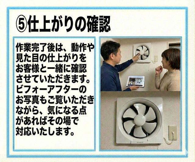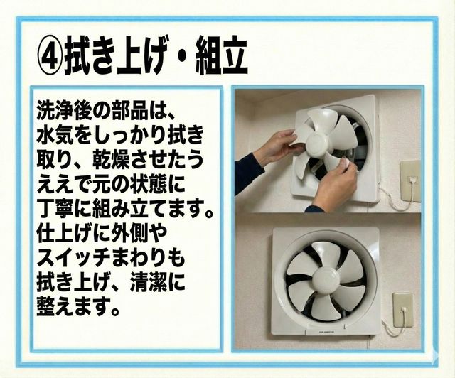 ハウスクリーニングの経験を活かし、プロペラ型換気扇の油汚れやホコリを丁寧に洗浄します。取り外せる部分は確認しながら清掃し、安心して使える状態に整えます。