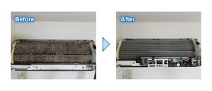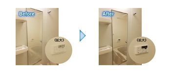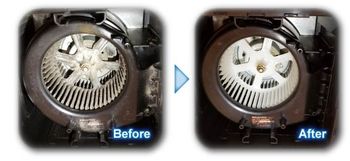 浴室の換気扇は土ホコリでとても汚れています。分解洗浄すればご覧の通り、とてもきれいになります!(別途オプションとなります)