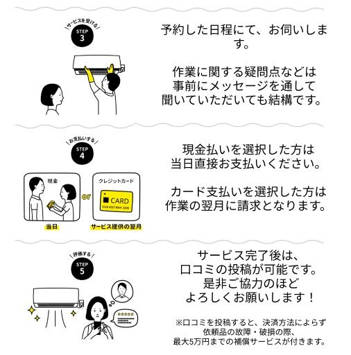 ・ご予約が集中し、ご希望の日時に伺えない場合がございます。その場合は、【メッセージ】にて改めて日時をお伺いします。