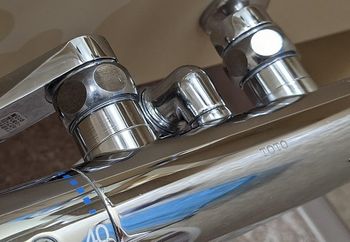 作業後のお風呂の水栓の状態です。適切な洗剤を使いつつ、表面に大きなキズが入らないよう、汚れだけを丁寧に落とします