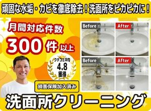 洗面台クリーニングのプロは、一般の掃除では落としきれない水垢やカビを専用の洗剤と道具で徹底的に落と…