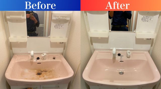 自分で掃除した場合の特徴 【仕上がり】 見た目はそれなりにキレイに見える。 水アカや石けんカスはある程度取れるが、細かい汚れや蓄積した汚れは残ることが多い。 【対応範囲】 手が届く・見える範囲のみの掃除になりやすい。 排水口の奥などは掃除が難しい。 【使う道具】 市販の洗剤・スポンジなどを使用。 傷がつかないように気を遣う必要がある。 【メリット】 コストが安い(洗剤代のみ)。 思い立った時にすぐできる。 【デメリット】 頑固な水アカやカビ、黒ずみは落としきれないことも。 時間と労力がかかる。 業者に依頼した場合の特徴 【仕上がり】 新品のような光沢と清潔感が出る。 長年たまった水アカ、カビ、黄ばみ、排水のぬめり汚れなど、プロ用の洗剤と技術で徹底的に除去。 【対応範囲】 排水口の中、蛇口の裏、鏡の端、ボウルの目地など、普段掃除しきれない細部まで対応。 必要に応じて分解清掃も可能(例:排水トラップの中など)。 【使う道具】 専用の機材や洗剤(市販品より強力かつ素材に優しい)を使用。 傷をつけずに研磨・コーティングする技術もある。 【メリット】 プロならではの圧倒的な清掃力と短時間仕上げ。 素材や汚れに合った最適な方法で掃除してもらえる。 【デメリット】 数千円〜1万円前後のコストがかかる(洗面台単体で依頼した場合)。 日時の調整が必要。
