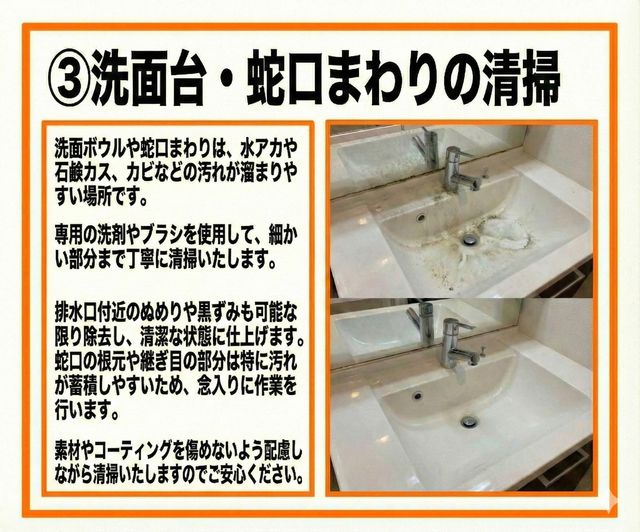 水垢・皮脂汚れ・石鹸カスを丁寧に洗浄する洗面所クリーニングサービス