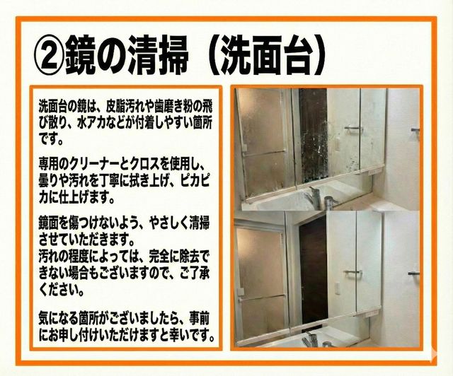 ハウスクリーニングの経験を活かし、洗面所の水垢や皮脂汚れを丁寧に洗浄します。鏡や洗面ボウルなど細かな部分まで清掃し、清潔で使いやすい空間に整えます。