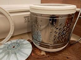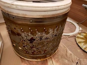 カビが気になる季節!洗濯機のご依頼が増えています。洗濯槽を外したところです。この汚れは洗濯槽を取り外してこすり洗いをしてあげないと落ちません。