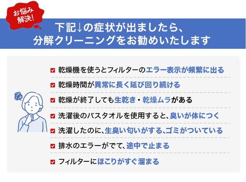 お悩み1位は乾燥機能の低下、2位は洗濯後の謎の臭い、3位は排水トラブル、分解洗浄でお悩み解決の上、衛生状態が良好となります