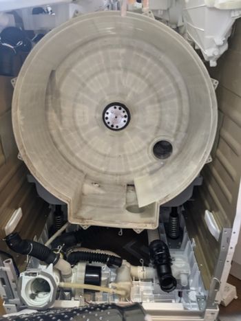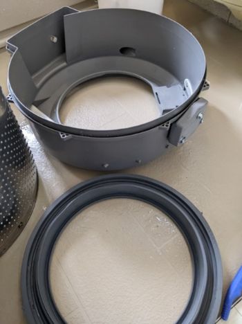 日立製のドラム式洗濯機、分解後のパーツ写真です。