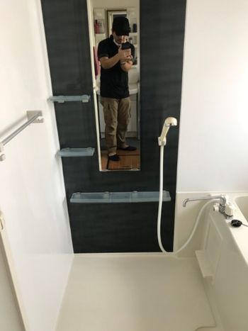 水アカ、湯アカ、カビ、石鹸カスがこびりついた浴室。
