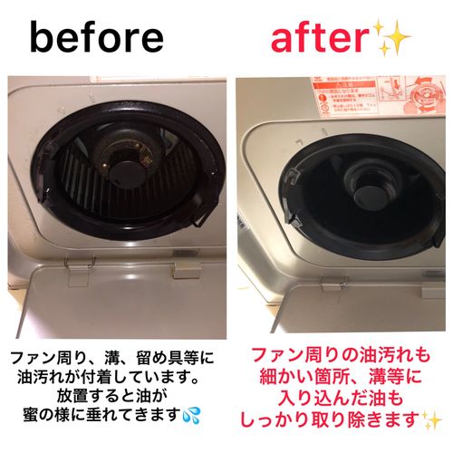 お風呂場と換気扇の掃除を依頼しました。お風呂場はカビだらけで換気扇も油ギトギトで申し訳なかったのですが、仕上がりをみてびっくり!!