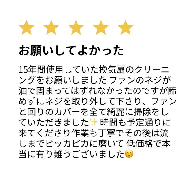 自分ではどうしても落とせなかった汚れもピカピカにしてくれてお風呂と換気扇は新築のようになりました。ありがとうございました。