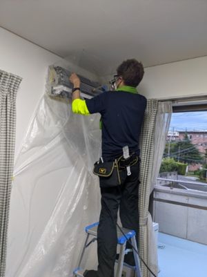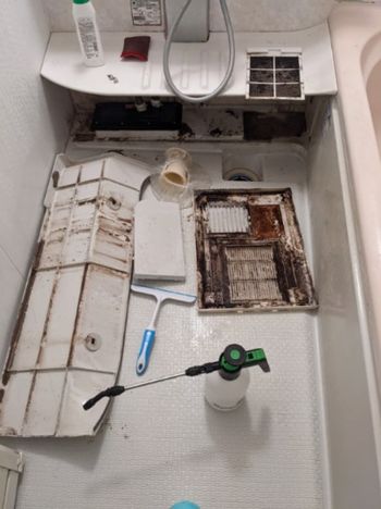 浴室のエプロンカバーを外すと…こんなにカビが…薬剤をつけて高圧洗浄機でズバっと落とします!