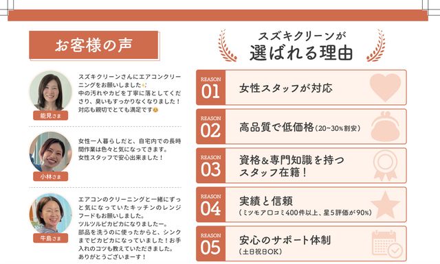 スタッフ全員が非喫煙者で、清潔な身なりと丁寧な接客を徹底。エアコンクリーニング士資格を持つスタッフが在籍しており、専門的な分解洗浄まで対応しています。