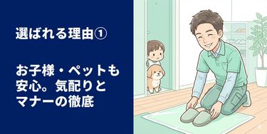 作業中は、小さなお子様やペットがいるご家庭への配慮を徹底しております。また、「来た状態より帰る状態をキレイに」というモットーのもと、クリーニング箇所はもちろん、機材搬入で通った廊下やお水をお借りした浴室・外水道まで、最後はピカピカに仕上げて撤収いたします。