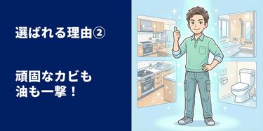 半年間の厳しい研修を経たプロスタッフが、キッチンの油汚れ、お風呂のカビ、トイレの尿石、洗面所の水垢、それぞれの汚れに最適な洗剤と機材を駆使して徹底洗浄します。