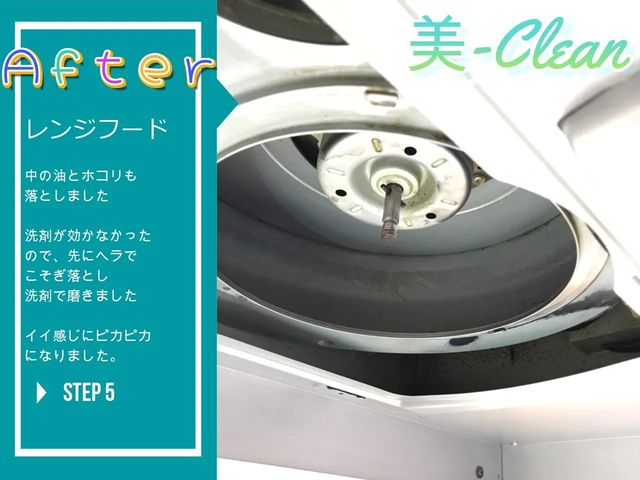 (4)レンジフード(換気扇)全体に洗剤を塗布して、汚れを落とし拭き上げ。