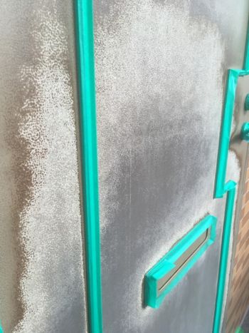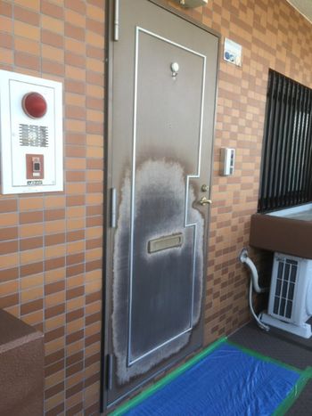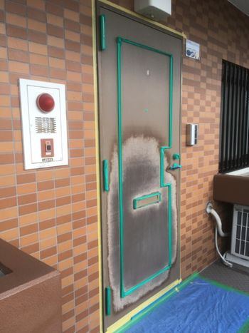 港北区 西日で変色したマンションの塩ビシート扉の塗装です。