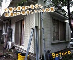 外壁サイデイングが割れ、雨水などが部屋内部に浸み込んでいる状態。また、ベランダの床には、湿気のため苔が生え、床も一部腐食している。