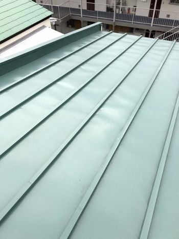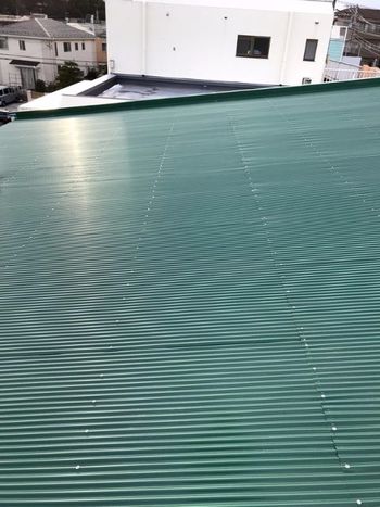 費用価格:既存瓦棒の上に針葉樹12ミリを張ってルーフィングを張って勾配が無いためガルバニウム小波銅板を張りました。