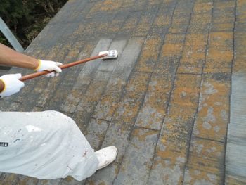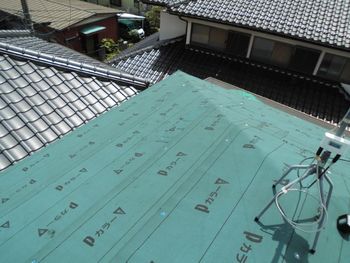 夏の熱い日でした。風向きによっては、玄関の上から雨漏りするので、費用は、安く、でも良い屋根材がないか。ご依頼でした。屋根安心隊で推薦している、日本ル-フの、しおさい、表面フッ素加工