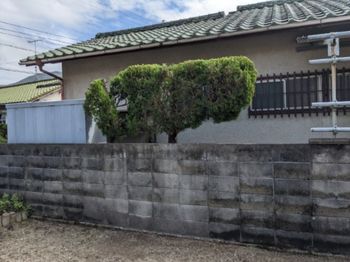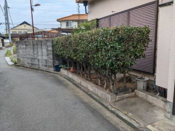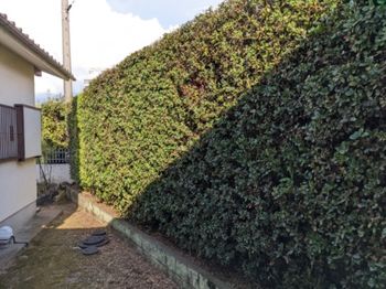・今回は空き家になっているキンモクセイの刈込をさせていただきました。隣のブロック塀と同じ高さになるよう気を付け、剪定で整えながら形を整えさせていただきました。