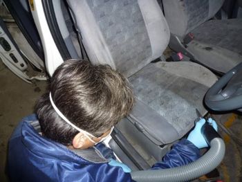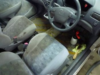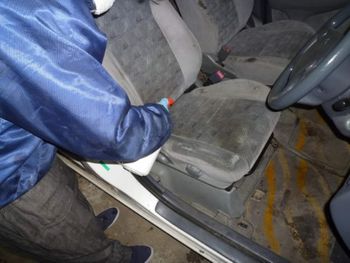 あきらめないでください!!当社の洗浄システムであれば画像の用に誰にでも素早く簡単に!!洗浄作業が可能ですよ!!勿論液剤がオリジナル!!除菌剤配合で生地に液剤を散布、液剤を生地に絡めて抗菌剤配合の液剤で濯ぐだけでこのように汚れが取れますよ!!他社さんの製品だと廃液がバケツ一杯になってます画像みますが当社のシステムだと廃液が従来のリンサーの1/10です!!ECOです!しかも廃液はほぼ中性ですからご安心ください
