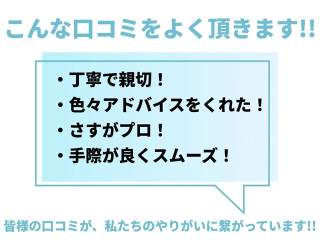 口コミはすべて実際に弊社をご利用いただいた大切なお客様のお声です。良くも悪くもご評価いただくことが私たちの励みになります!