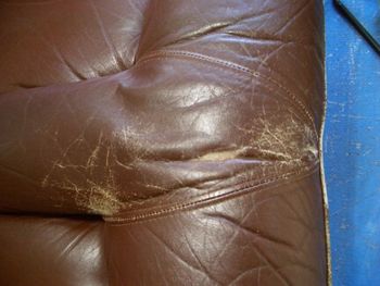 こちらは2人掛け革ソファの修理例です。ご使用約10年目位の座面と背もたれの部分補修です。