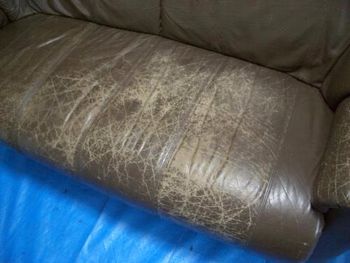 こちらも2人掛け革ソファの補修例になります。 座面、肘掛け中心にひび割れと色褪せが進行した状態。