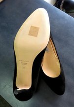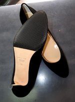 ■スェードにドットプリントの 履きやすそうな、ほとんどフラットな 低いウエッジシューズです。ですがリフト部分を摩耗が通りこしています。,