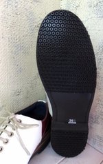 ■スニーカーファンの世界は私は門外漢なのでよくわかりませんが、このハイカットは限定モデルで貴重なものだそうです。永く実用に供したいということで、磨耗対策としてVibramのスカルソールでプロテクションすることになりました。標準のソールを削ってマットな状態にして くぼみの深いところはコルクを埋めて下地を処理して、作業時に出る削りカスから本体を守るためにキャンバス地を養生しました。ゴム質はスポーツ系のスニーカーと同質のゴム質で、グリップと耐久性は申し分ないです。