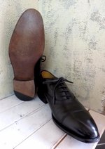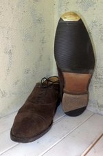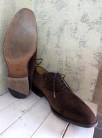 ■メンズの茶系のバルモラルですが、濡れて乾いてを繰り返しこんな状態です。シミの状態が酷いため、完全にシミが消えるのは厳しそうなので仕上げのグラデーションでごまかす方向でなんとかします。今回の洗い料金は¥4000 + tax革付きリフト ¥4000 + tax ,