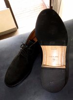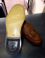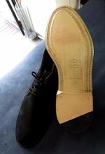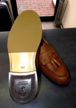 ■長い事商売していますが,レスリングシューズやボクシングシューズなどの修理は経験ありましたが、はじめてのモンゴル相撲のブーツに滑止めをというオーダーです。当店はアジア系の観光客が頻繁に行き来する通りにありますが、その方達が当店に入ってくる事はほぼなく、今回は片言の日本語で話していただけたので助かりました。モンゴル人は日本人の源流なので見た目は日本人でしたが、やはり服装のテイストと色使いが違うので外人というのはすぐに判ります。英語だけでもかなりだめなのに、アジア圏の言語にも対応できる方法を考えなければなりません。困った!底は青革という、ダンスシューズに使われているものと基本的に同じで、先端から2~3センチ下げて貼る事と,表面のピラミッドパターンを,