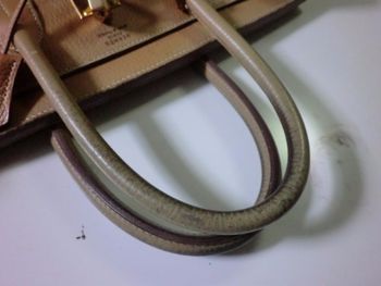 ■ブランド:エルメス ■バーキンの持ち手の補修例。 色が抜けて黒ずんだ状態です。,