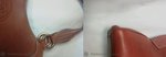 ■元々の状態:湿気によって、ポケットのコットン生地の縫製接着部分から接着剤の成分が染み出して変色を起こしていました。