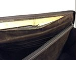 ■加工内容:片側のマチ部分にシミがありました。水分がついた時に、すぐにふき取ることができればよいのですが、時間が経つとその水分によって皮革を染めている色が動いてこのように端が濃くなってムラができてしまいます。今回はこの濃い部分をシミ除去で薄くしたあと、周辺をムラがないようにお色のせして目立たなくしました。