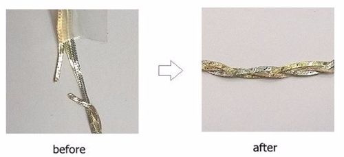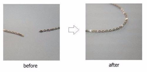 大阪市のお客様よりチェーンの修理をご依頼いただきました。 この部分は、引っ張ってしまって、よく取れてしまう事ごあります。 丸かんが外れてしまっているだけなので、丸カンを元の場所に戻し、丸くしてロウ付けして出来上がりです。