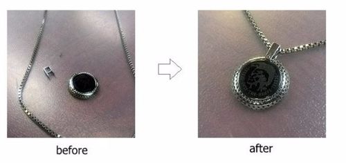 お客様はたいそうにお考えになられますが、簡単に直せます。 丸かんが外れてしまっているだけなので、丸カンを元の場所に戻し、丸くしてロウ付けして出来上がりです。