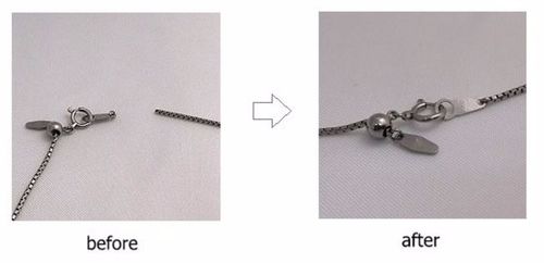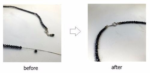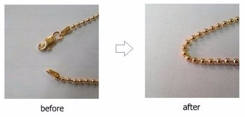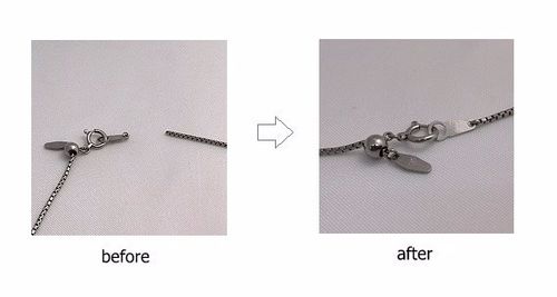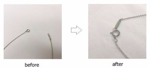 お客様のロングチェーン80㎝の留め具が壊れてしまい、さらに普段から小さくて留めにくかったので、頭からかぶれるように留め具を取り除き、その分のチェーンを同じ形のボールチェーンを足す事によって一体のチェーンに仕上げさせていただきました。