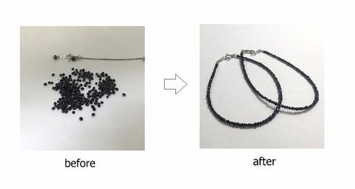 大阪市のお客様よりブラックダイヤモンドネックレスの修理をご依頼いただきました。最近、多いですね~。 今回は切れてしまったので、ブレスレット2つに変更してお作りさせていただきました。