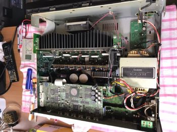 ONKYO TX-SA706Xの電源が入らなくなったという事でした。通電しても何も変化もなく、本体電源ボタン、リモコン電源ボタンを押しても何も変化が無かったので、分解してみた所、基板上にホコリが多く、とりあえず掃除して通電してみた所、本体のスタンバイLEDが点灯し、その後、どちらの電源ボタンでも電源が入りました。