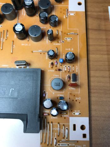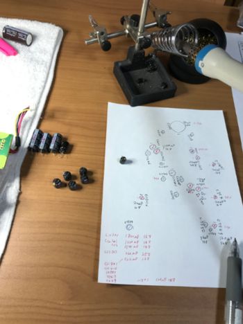 写真も撮りますが、配置とマイナス側のメモをしながら、容量のチェックをして、交換するコンデンサの種類、数を特定します。