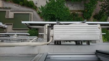 屋上に室外機設置作業。