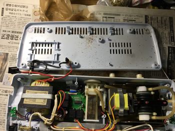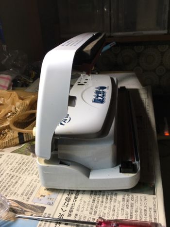 アイロンでは無いのですが、真空パック器(脱気シーラー)吸太郎 AS-V-001の修理風景 両脇のPUSHを押して、ロックが外れると、上部分がはね上がっていたのが、はねあがらなくなったという事で依頼を受けました。