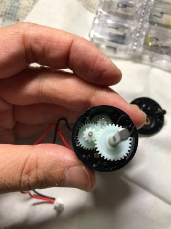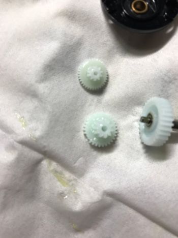 左下の歯車の写真で8時あたりに2山分の欠けがあります。同じサイズがありませんでしたので、似ているサイズを代用し動く様になりました。最初、少しだけ片側に寄る様に動いていましたが、学習するのか?お客様の所では、だんだん真っ直ぐに進む様になったという事でした。